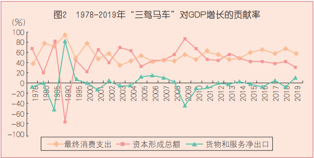 从下图可以看到,1978—2019 年“三驾马车”对我国 GDP 增长的影响大致可以分为四个阶段:第一阶段为 1978 年到 1985 年,消费对经济增长的贡献率快速上升,投资对经济增长的贡献率波动较大,而净出口对经济增长的贡献为负; 第二阶段为 1985 年到 1995 年,三者对 GDP 增长的贡献率波动较大;第三阶段为 1995 年到 2009 年,投资对经济增长的贡献率呈波动上升状态,消费对经济增长的贡献则较为稳定,而同期净出口对经济增长的贡献较小;第四阶段为 2009 年到 2019 年,投资对经济增长的贡献波动下降,而消费对经济增长的贡献波动上升, 说明我国经济的增长正从投资驱动型向消费驱动型转变。